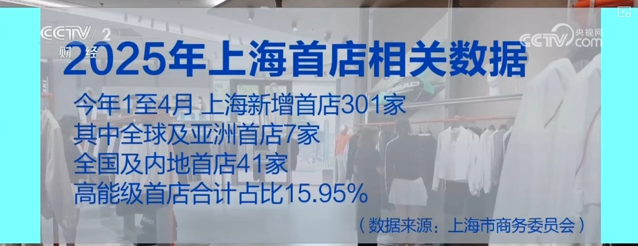 2025年以来,上海首店经济发展势头依然强劲。上海市商务委员会数据显示,2025年1至4月,上海新增首店301家。其中,全球及亚洲首店7家、全国及内地首店41家,高能级首店合计占比达到15.95%。