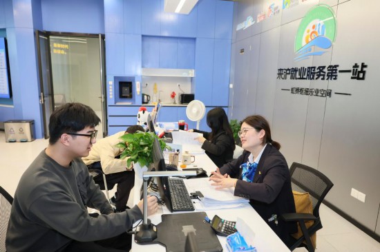 4月8日,上海虹桥枢纽乐业空间举行4月首场招聘会,求职者(左一)在现场咨询职业技能补贴政策。新华社记者 王翔 摄