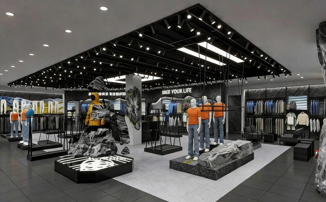 门店主打高端专业户外定位,融合轻奢质感,以黑金为主色调,搭配奥地利阿尔卑斯山岩纹肌理墙面,打造沉浸式购物空间,彻底打破了传统奥莱店的廉价感。