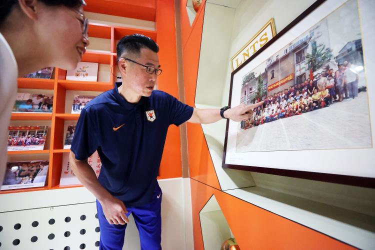 来到三楼,队员们走进学校荣誉室,参观学校获得的奖项以及与俱乐部之前的合影。宿茂臻的目光被一张1998年的合影吸引,他神色动容地说:“1998年,我第一次来到泺源学校,记得有一天在训练时,我看到场外有一些孩子在参观。训练结束后,我主动上前和他们交流,这才知道他们是泺源学校的学生。回到俱乐部后,我向领导汇报了想为这些孩子提供帮助的想法,很快得到了领导的支持。随后,我向教练员和全体队员发起对泺源学校的孩子们献爱心的活动。今天,我又来了这里,看到所有老师这种对生命的尊重、对教育的热忱,与泰山足球精神中的‘精诚团结、坚韧不拔、勇攀高峰’不谋而合,这让我们明白一家优秀俱乐部不仅要在赛场上拼搏努力,也要始终坚守公益初心,永不改变。”