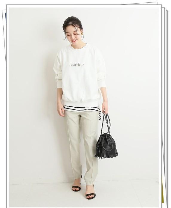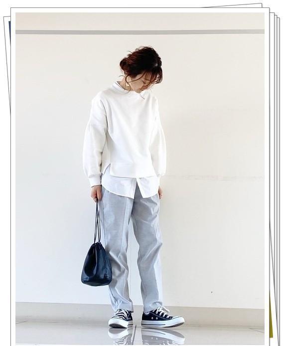 白色运动衫和白衬衫叠穿在一起,裤子是带有中线的小脚裤,而鞋子和包包是黑色,这是一种鲜明的黑白灰配色造型。由于中线裤和白色衬衫的存在,虽然是休闲造型,但看起来简洁而干净。