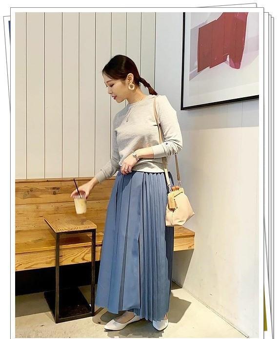 蓝色喇叭裙和白色运动衫相结合,带来春天般的清新穿搭感。高帮帆布鞋也是一种不错的选择。
