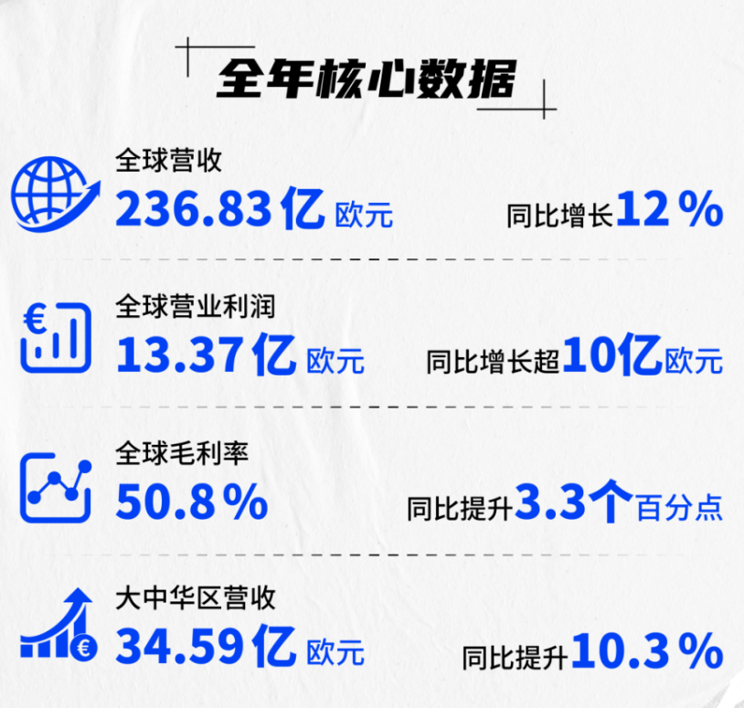 近日,阿迪达斯公布2024财年财报,数据显示,这家德国运动巨头全球销售额攀升至236.83亿欧元,同比增幅达12%。其中,大中华区表现尤为亮眼,全年营收达34.59亿欧元,同比增长10.3%,连续七个季度实现高质量增长,成为推动品牌复苏的重要引擎。